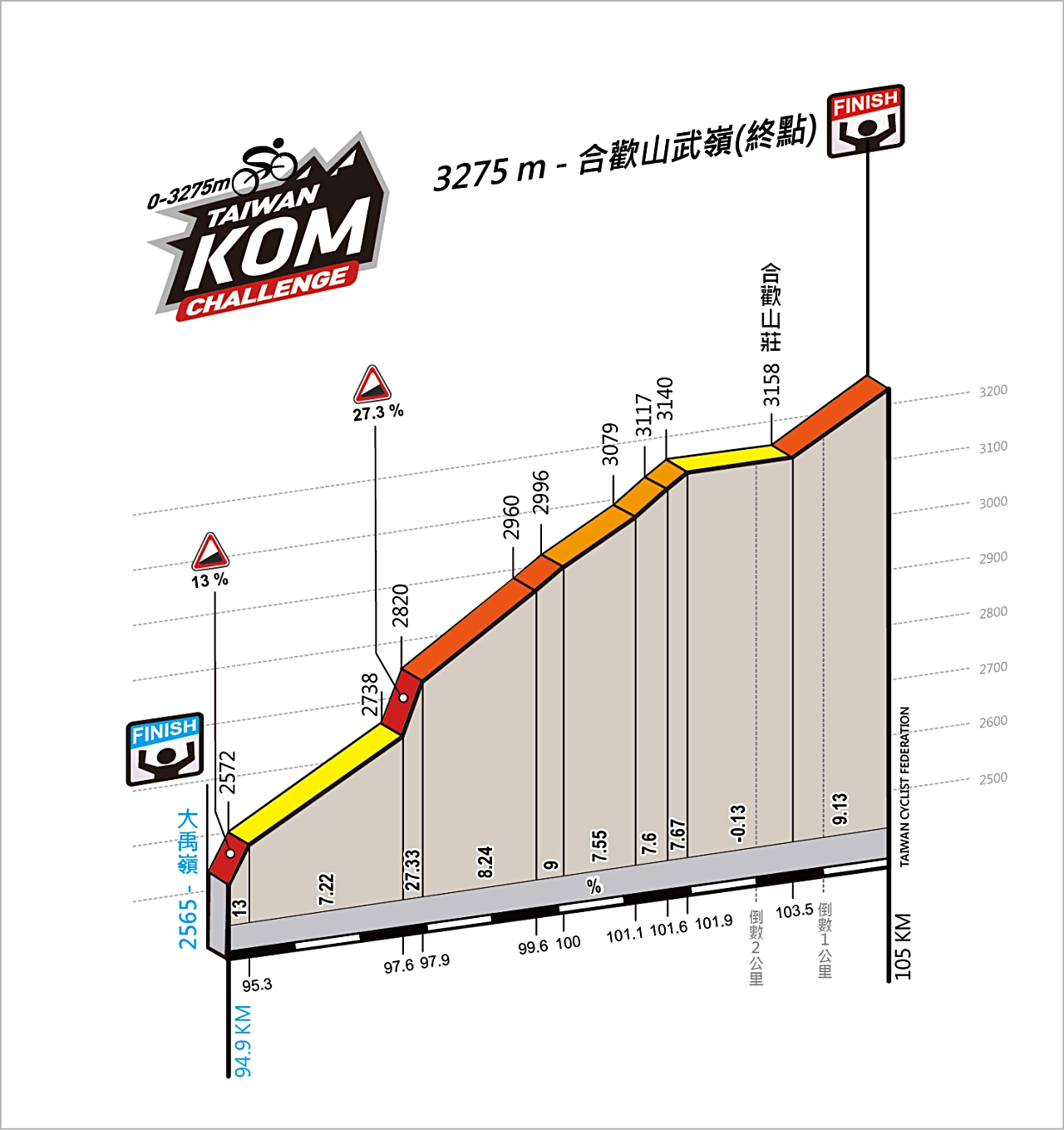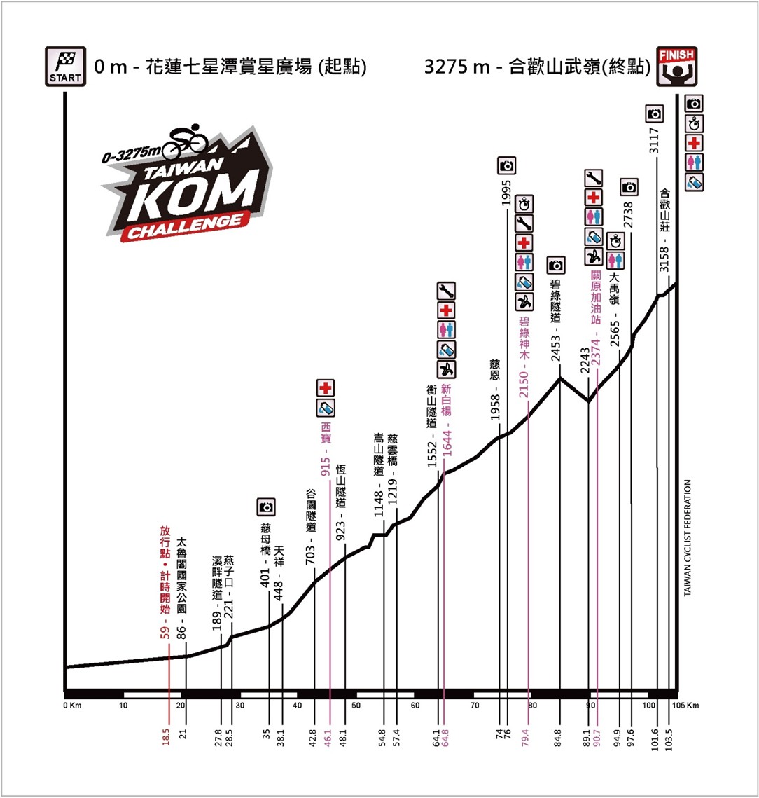 2020 臺灣kom 登山王之路-夏季 臺灣自行車登山王挑戰這條風情萬種窈窕多姿性情不定瞬息萬變的朝 聖級路線所有車友都想一親芳澤還在顧慮東進武嶺到底是多麼高強度那麼在 前進kom 登山王挑戰之前何不來一場臺灣kom 登山王之路以. 2021臺灣自行車節 Taiwan Cycling Festival 臺灣KOM登山王之路-夏季 The Road to Taiwan KOM - Summer 20210906 Mon. 路線從海拔0公尺的花蓮七星潭爬升到標高3275公尺的武嶺全長105公里被法國知名自行車雜誌Le Cycle評比為世界十大艱難的挑戰之一具備與歐洲阿爾卑斯山同等級的挑戰性與美景已成為全世界自行車車友心目中一生至少要挑戰一次的經典路線 比賽總排名由台灣女婿曾三次拿過KOM.